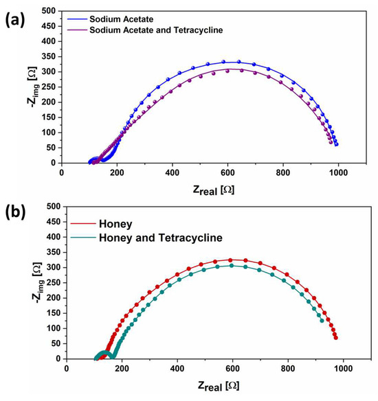 (a) Impedance spectra of SCMFCs when sodium acetate with and without tetracycline was used as the electrolyte. Sodium acetate (blue dots and line) and sodium acetate with tetracycline (pink dots and line). (b) Impedance spectra of SCMFCs when honey with and without tetracycline was used as electrolyte. Honey (dark red dots and line) and honey with tetracycline (dark cyan dots and line).