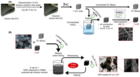 Figure 1. (A) Schematic of the preparation of CF and activated CF (A-CF) anode substrates and their dipping (B) for three cycles in a conductive CNF dispersion solution using SDBS surfactant or CS as dispersing agents.
