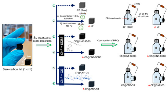 Figure 2. A detailed scheme summarizing the sequential step preparation of CF anodes and their utilization in single-chamber bottle-type MFCs. Both pristine CF and CF directly treated with concentrated H2SO4 and thermally involved at 450 °C (A-CF) were used as anode substrates for CNF coating. The prepared CNF dispersions (CNF in SDBS or CS) served as immersion solutions for dipping CF and A-CF.