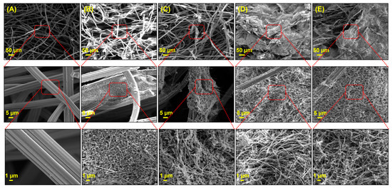 Figure 3. SEM images of (A) pristine CF, (B) CNF/CS-coated CF, (C) CNF/CS-coated A-CF, (D) CNF/SDBS-coated CF, and (E) CNF/SDBS-coated A-CF anodes.