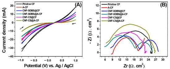Figure 4. (A) CVs at different CF-based anode surfaces of 10 mM [Fe(CN)6]3−/4− and 0.1 M KCl in the potential range of −1 to 1 V vs. Ag/AgCl. Scan rate 100 mV s−1. (B) Corresponding Nyquist plots at OCP values.