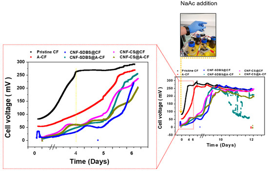 As shown in Figure 5, the voltage outputs of the MFCs were recorded over an 11-day period to monitor biofilm growth on the six CF anodes, which included uncoated and CNF-coated pristine CF or A-CF anodes. As observed, the voltage of the MFC equipped with a pristine CF anode increased more rapidly, reaching 275 mV during the first four days of MFC running, and then slightly increased to reach a nearly stable value of 300 mV. Although the acid-heat treatment could increase the electrical conductivity and hydrophilicity of the CF [30], the biofilm growth kinetics were still lower than those of pristine CF. These results suggest that electrogenic bacteria are more likely to adhere/colonize faster on hydrophobic surface [31]. The acid-heat treatment or coating the CF/A-CF electrodes with CNF increased their conductivity and enhanced charge transfer rate. However, in the MFC configuration, pristine CF demonstrated the best performance in terms of its high affinity towards electroactive bacteria and faster biofilm formation. In addition, the results obtained are consistent with those reported in a recently published study, which showed that chemical treatments did not bring much improvement in power output [8]. Hence, it can be concluded that pristine CF alone may be sufficient to achieve satisfactory electrical performance in MFC systems.