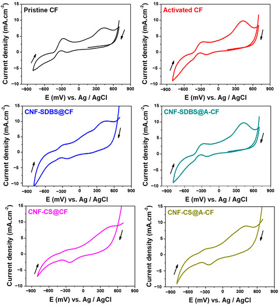 3.2. Electrochemical Properties of Unmodified and Modified CF Electrodes