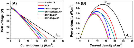 Figure 7. (A) Polarization curves recorded using LSV after 11 days running (biofilm maturation) of single-chamber MFCs equipped with different CF-based anodes and containing wastewater and 10 mM NaAc substrate, and (B) corresponding power density curves. Scan rate 10 mV s−1.