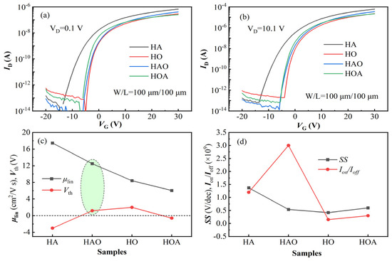 As shown in Figure 2c, the HA-TFT shows high electron mobility, while Vth is negative due to the excessive content of background electrons. On the contrary, the electron mobility of ZTO TFT prepared via the channel in high-oxygen conditions (HO-TFT) is low, and the Vth is positive due to the finite electrons ionized from oxygen vacancy. For the homojunction channels, when the oxygen-vacancy-enriched ZTO layer is close to the GI (HAO-TFT), high mobility and desirable threshold voltage were achieved. In the opposite case (HOA-TFT), not only the mobility declines but also the Vth becomes negative. The variations in Vth in the homojunction channels can be explained as follows. The back channel with fewer oxygen vacancies is favored for achieving positive Vth due to the high insulation, which hardly needs more gate voltage to deplete the conduction electrons. On the contrary, when the back channel is conductive, negative voltage is essential to deplete excessive electrons to achieve an acceptable off-state current. Figure 2d shows the variations in SS and current ratio between the on-state and off-state (Ion/Ioff). The SS of HA-TFT is obviously higher than others, which can be plausibly attributed to the poor interface quality due to the considerable content of trap-state oxygen vacancy [20]. In addition, all the Ion/Ioff is above 108, and the highest Ion/Ioff (3 × 109) is obtained in HAO-TFT.