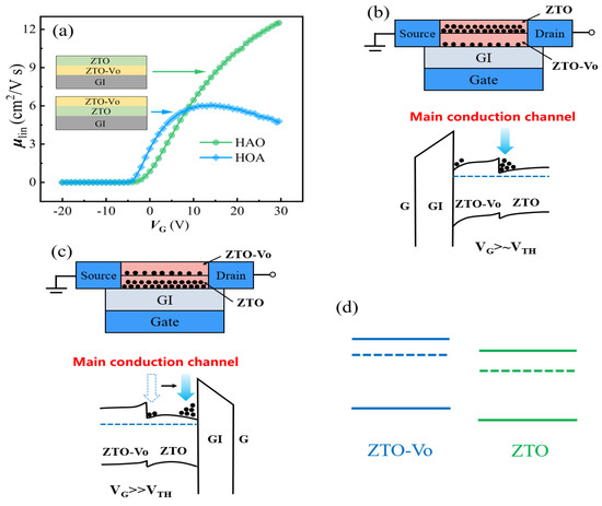 It is necessary and interesting to investigate the intrinsic conduction mechanism for the homogeneous junction channel. Generally, the mechanisms related to multilayer channels include charge compensation, composite channel and a 2DEG channel. To possibly distinguish the dominant mechanism, the linear mobilities with respect to different gate voltages are extracted, as shown in Figure 3a. With an increase in VG, the μlin of HAO-TFT increases gradually, while that of HOA-TFT increases first and then declines. Hence, it is believed that the electron conduction mechanism is different across the two devices. Figure 3b,c show the possible electron transport models and energy band structures. The electrons transfer from one layer to another due to the difference in electron concentration and then reach an equilibrium state under the effect of the built-in electric field, not only resulting in the alignment of Fermi energy levels but also the bending of the conduction band (CB) and valence band (VB). In the case of HAO-TFT, electrons are localized in the interface between the ZTO and oxygen-vacancy-enriched ZTO (ZTO-Vo) active layer, and a quantum well may be formed on the ZTO side and serve as the main conduction channel. It is hardly affected by the gate voltage, even at a considerable value, and accounts for the continuous increase in mobility with respect to VG. Electron transport in quantum wells is much easier due to the reduction in scattering and electron trap [21]. In addition, according to the percolation conduction theory, the mobility is, overall, positively correlated to the electron concentration due to the relatively decreased electron conduction barriers [22], which is opposite to the case of silicon-based semiconductor materials. That is, the enhancement in mobility also results from the accumulation of electrons in the quantum well. In the case of HOA-TFT, the quantum well is susceptible to an external electric field, which would be opened when the VG reaches a certain level, resulting in a shift in the main conduction channel from the homojunction interface to the front interface [23], as illustrated in Figure 3c. The interface quality of the front channel is generally lower than that of the homojunction interface due to the obvious differences in material structures between SiO2 and ZTO, which could result in significant lattice mismatch and more dangling bonds. Then, electron transport is restricted, and the decline in mobility occurs when the VG is high. Based on the above analyses, the basic energy band structure of ZTO with and without oxygen vacancy can be inferred, as shown in Figure 3d. That is, the formation of an oxygen vacancy would elevate the energy of both CB and the Fermi level. Simultaneously, the energy difference between CB and the Fermi level is reduced and results in the increased content of electrons, which is consistent with the reported literature [24,25].