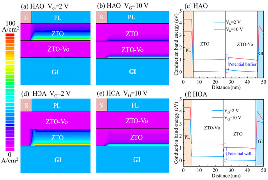 To further confirm the rationality of the proposed physical model and electronic transport behaviors, TFT device simulations based on Silvaco TCAD were performed using the ATLAS module, as shown in Figure 4. The simulated current density of HAO-TFT is depicted in Figure 4a,b. When the applied gate voltage is not too high (VG = 2 V), the main conduction channel is located at the homojunction interface between the ZTO layer and ZTO-Vo layer. More specifically, the electrons transport in the ZTO layer, while the conduction channel partially shifts to the front interface between ZTO-Vo and GI when the VG increases to 10 V. It indicates that the electrons would preferentially transport at the homojunction interface, unless the VG is high enough. This behavior can be attributed to the formation of potential barriers on the side of the ZTO-Vo layer, evident from the simulated conduction band structure (Figure 4c). An upward step-like potential barrier was formed, and more energy is needed for electrons to overcome the energy barrier for conduction channel migration. In the case of HOA-TFT (Figure 4d,e), the conduction channel already exhibited a movement tendency to the front interface between ZTO and GI, even at a low VG, and the increase in VG exacerbates the migration behavior of the main conduction channel because the downward step-like energy potential well formed on the side of the ZTO layer can be more easily opened by the gate bias voltage due to the shallow depth, as shown in Figure 4f. That is, the stabilities of the potential barrier and potential well on gate voltage are different, and the order of homojunction/heterojunction layers is critically important to the TFT performance. It is also worth noting that the mobility of HAO-TFT would decline as well when the main conduction channel transfers to the front interface at a high enough gate voltage. The key advantage of HAO-TFT is that the gate voltage ranges of continuously increased mobility are greatly extended, compared with HOA-TFT, which is significant for practical applications. All the simulated results are consistent with the experiment results and the proposed physical models. This work demonstrates the feasibility of an enhancement in TFT performance by adopting a homojunction channel strategy, which is generalizable to other semiconductor materials and electronic devices.