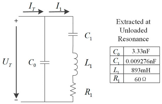 The analysis of piezoelectric transducers using equivalent circuit models is a common approach. The Butterworth-van Dyke (BVD) equivalent circuit model [] of a piezoelectric transducer is shown in Figure 2.