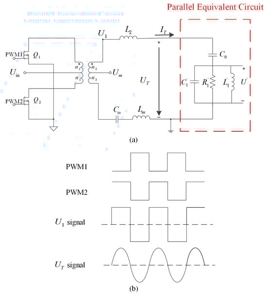 Figure 5b shows the waveform of the proposed scheme. Under the action of two PWM waves with a 180° phase difference at the gate, the two switching tubes of the push–pull inverter alternate conduction through the center of the transformer primary, which in turn converts the direct current (DC) into an alternating current (AC). Since the output voltage of the push–pull inverter is a square wave, it is necessary to use a matching circuit to filter the square wave into a sinusoidal signal. Therefore, an inductor is added to the secondary side of the transformer in series with the piezoelectric transducer to form a matching circuit. The matching circuit filters the voltage waveform and provides impedance matching.