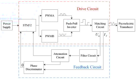 Figure 6 shows the hardware architecture of the frequency tracking and amplitude control scheme based on the push–pull inverter, including the STM32 microcontroller, DC power supply, push–pull inverter circuit, matching circuit, piezoelectric transducer, and feedback circuit.