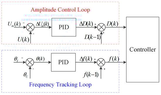 The control block diagram architecture is shown in Figure 7, including the frequency tracking loop, amplitude control loop, and two PID controllers. The and amplitude are detected by processing the feedback signals and . The frequency tracking control loop detects the based on the between the tap voltage and the excitation current , and adjusts it in real-time to make the phase difference converge to 0°. The purpose of frequency tracking is to make the piezoelectric transducer operate at the to ensure maximum output power and energy efficiency.
