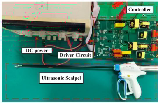 In this paper, the proposed scheme is verified by the ultrasonic scalpel (BT-US-C55; Bantuo Medical Technology Ltd., Xiangtan City, China). The excitation frequency of the ultrasonic scalpel is 55.5 kHz ± 5.5 kHz. The input voltage was selected as 36 V from a DC power supply. The driver circuit can output two-phase driving voltage, which can be used to provide driving signals for a variety of ultrasonic devices. The experimental setup is shown in Figure 8. The amplitude of the piezoelectric transducer is measured by a laser displacement sensor (LK-H008; KEYENCE, Osaka, Japan). The measurement setup is shown in Figure 9.
