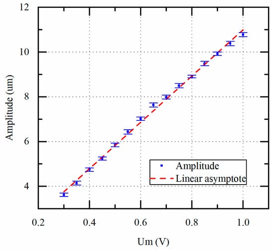 First, the unloaded amplitude of the piezoelectric transducer and the tap voltage is measured to verify the correctness of the scheme. In this experiment, the tap voltage is controlled from 0.3 V to 1.0 V by the proposed scheme, and the actual vibration amplitude is measured by the LDS. The LDS has been calibrated by the manufacturer. Each measurement was repeated 5 times.