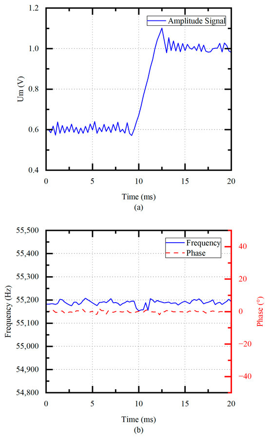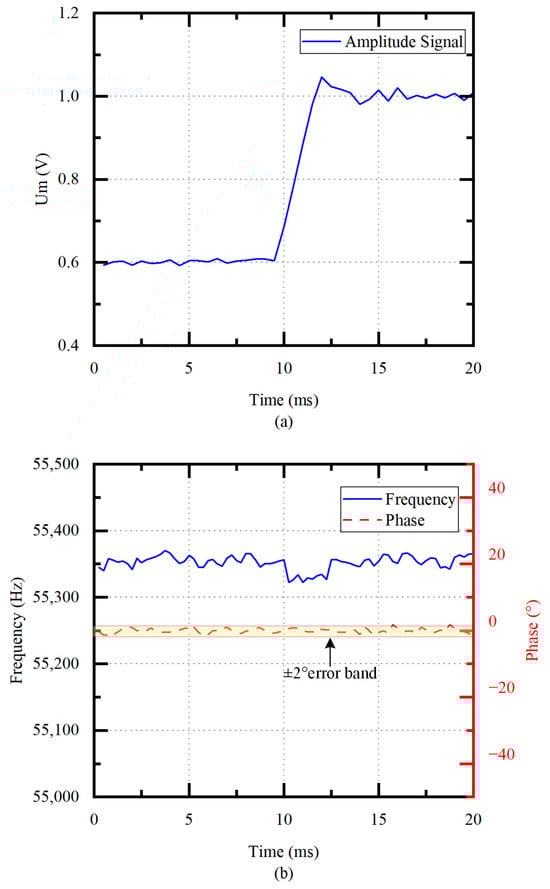 In order to verify the performance of frequency tracking and amplitude control, the frequency and phase are measured when the tap voltage increases from 0.6 V to 1.0 V at unloaded conditions. As shown in Figure 11a, the error of the is within ±0.01 V when the system is stable. Figure 11b shows that the drive frequency quickly returns to the with the frequency fluctuation of smaller than 50 Hz under frequency tracking. The phase error is within ±2°.
