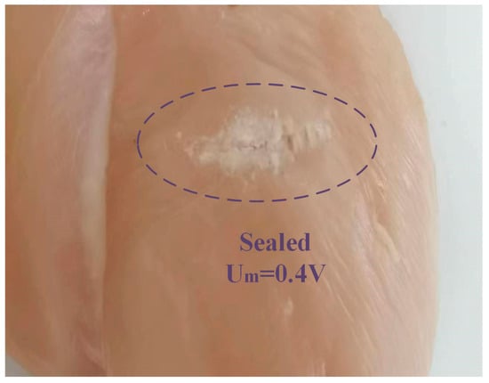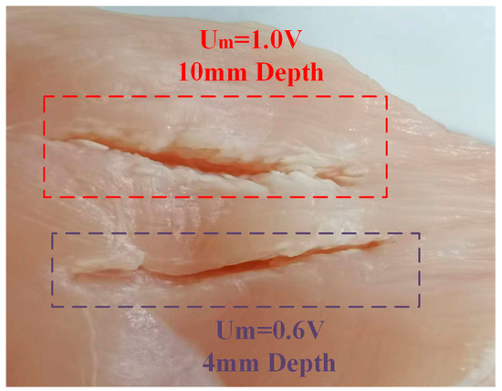 To test the ultrasonic scalpel capabilities of the amplitude control performance, a piece of chicken breast tissue was cut, as shown in Figure 14. High amplitude provides high output power for clean dissection. When = 0.6 V, the cutting depth is 4 mm. When Um is set to 1.0 V as the higher amplitude, the high power results in a deeper cut at 10 mm. The sealing function was measured with low amplitude.
