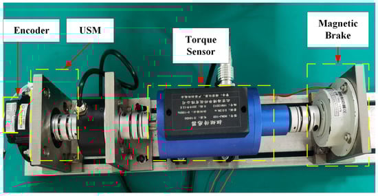 The proposed scheme is further validated in USM to verify the amplitude control performance in a wide load range. The designed driver operates on a USM Shinsei-USR60 with a load torque ranging from 0.1 Nm to 0.3 Nm, which quantitatively verifies that the proposed scheme can achieve amplitude control under variable loads. Table 2 lists the characteristics of the USM. The experimental setup for USM is shown in Figure 16. The load torque is provided by a magnetic brake (FKG-10YN; Lanmec electromechanical technology Co., Ltd., Hai’an City, China). An incremental encoder (HEDM-5540-B14; Broadcom Inc., San Jose, CA, USA) detects the velocity. A torque sensor (HCNJ-103; Haibohua Technology Co., Ltd., Beijing, China) with a range of 0 ± 2 Nm is used to measure the output torque and displays the value via attached instrument.