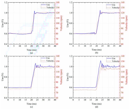 The velocity is linear to the amplitude of the USM due to the slight variation in the working frequency []. Therefore, the velocity can represent the amplitude of the piezoelectric transducer in this experiment. The velocity responses of the USM with the amplitude control are measured when the target voltage increases from 0.6 V to 1.0 V. The loads are set at 0 Nm, 0.1 Nm, 0.2 Nm, and 0.3 Nm, respectively.