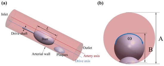 During atherosclerotic plaque removal through atherectomy, the coupled motion of the grinding wheel and blood flow in the vessel is a critical factor to consider. The hydrodynamic pressure film between the tool and the plaque is relatively thin, allowing direct contact and grinding of the plaque. Conversely, when the tool encounters the normal blood vessel wall, the dynamic pressure film between the tool and the vessel wall becomes thicker. This thicker film acts as a barrier, preventing the tool from grinding the normal blood vessel tissue. To simplify the rotational flow of the grinding wheel within the artery, an ellipsoidal shape is utilized, and this penetrates deep into the vessel through a guide rod. The resulting flow can be simplified as an eccentric annular flow with internal cylindrical rotation, as shown in Figure 1. These experiments are conducted using arterial columns with diameters of 5 or 6 mm to study coronary or peripheral plaque removal procedures, respectively [,]. The catheter used in these experiments is set parallel to the arterial axis, with an ellipsoidal protrusion on the exit end to simulate intravascular plaque deposition. In these experiments, a 0.1 mm clearance is left between the grinding tool and the cylindrical arterial wall to facilitate the removal of plaque from the inner wall of the vessel []. The blood flow velocity within the artery is highly rapid, averaging around 18–23 cm/s. The entrance speed is set at 20 cm/s to maintain a stable flow. The initial pressure at the outlet is set to zero to simulate a sufficiently long blood vessel. To study its effects comprehensively, the rotational speed is set to 110,000 rpm, 125,000 rpm 140,000 rpm, 155,000 rpm, and 170,000 rpm. These speeds are chosen based on their relevance to clinical settings and to capture the range of rotational speeds typically used in atherectomy procedures.