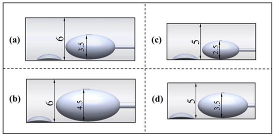 In this study, three diameter sizes (2.5 mm, 3.5 mm, 4.5 mm) of rotary grinding tools were selected as rotary grinding tools [], and their head size parameters and structures are shown in Table 1 and Figure 2. According to the different sizes of vessel diameters (5 mm, 6 mm), four groups were set up for comparison experiments wherein the B/A value is the point we focus on, which is an important factor affecting the stability of the flow field under the working condition of the rotary grinding device [].