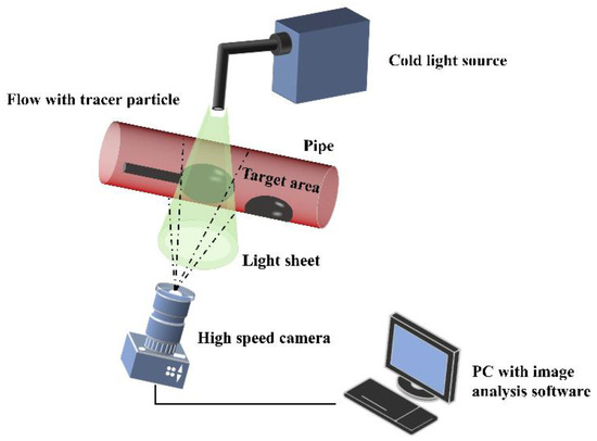 In addition to conducting a computational fluid dynamics (CFD) study of plaque spinning, the macroscopic flow inside the aneurysm was also examined using the laser particle image velocity (PIV) field testing technique. The PIV technique is a well-established and widely used full-field, interference-free, transient measurement method for flow velocity in fluid mechanics research. The basic principle of PIV is illustrated in Figure 3. In a PIV experiment, a large number of tracer particles that strongly follow the flow are introduced into the measured flow field. A laser emits a sheet light source onto the region of interest, and after several exposures, motion images of the tracer particles are obtained using a high-speed camera. The instantaneous spatial position changes of the particles are recorded and analyzed to provide velocity information of the flow field. Through this method, we were able to obtain accurate and comprehensive flow velocity data for the aneurysm. These results were then compared with those from the CFD simulations, confirming the reliability of our computational approach.