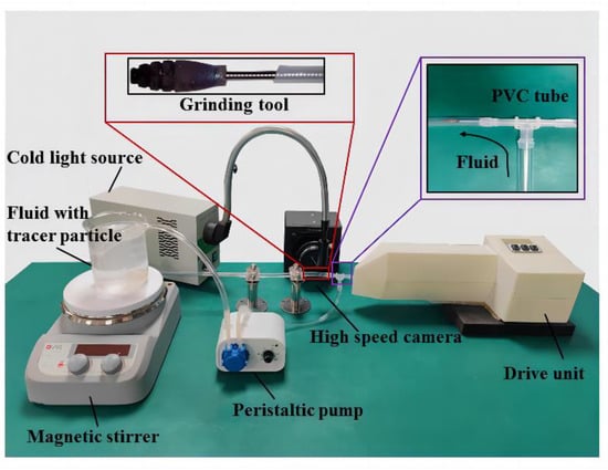 The grinding experimental platform is shown in Figure 4, and it consists of grinding device, fluid delivery systems, measurement systems, and light source system. During the experiment, the measurement area was illuminated with a cold light source, and the image data were collected using a high-speed camera. To avoid the flocculation of measured tracer particles in the liquid, deionized water was used as a blood substitute in this study and a magnetic stirrer was used to continuously stir. Moreover, the liquid flow rate was set to 30 mL/min. The deionized water with debris was made to flow through a PVC pipe and collected in a reservoir for further analysis.