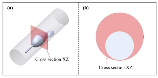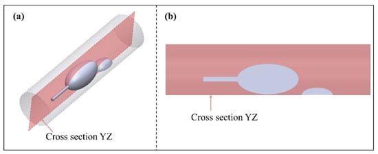 A cross-section YZ was added inside the simulated vessel, and the cross-section YZ passed vertically through the axes of the vessel and the rotating grinding tool, as shown in Figure 5. By observing the flow velocity distribution on the cross-section YZ, the flow field domain in the motion state of the rotating grinding tool could be analyzed.