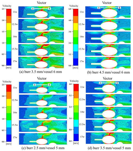 The size and rotational speed of the rotating grinding tool affect the flow velocity distribution in the arterial vasculature. Figure 6 shows the velocity clouds for different groups at different rotational speeds, as well as the velocity vector plots.