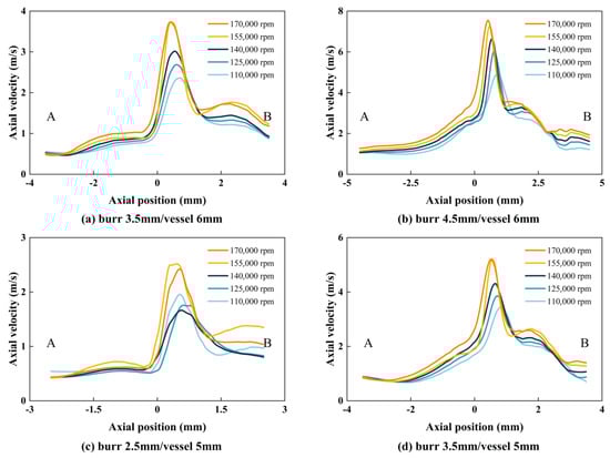 A velocity probe line was added to the velocity cloud of cross-section YZ, with the radial direction of the probe line passing vertically through the center point of the grinding tool and the axial direction in the direction of the central axis of the uppermost end of the grinding tool and the vessel wall surface. The velocity value magnitude was exported using Tecplot and processed using Origin to obtain a graph of the velocity magnitude on the probe line. As shown in the analysis presented in Figure 7, the magnitude of the velocity on the detection line is related to the diameter of the grinding tool and container. As the rotation speed increases, the velocity on the detection line also increases, and there is no significant change in the size of the velocity in the axial distance. This indicates that the increase in rotation speed does not extend the high-speed region to the axial direction. The smaller the grinding tool whose diameter is 2.5 mm is, the smaller the peak velocity on the detection line is. For the same diameter of blood vessels and rotational speed, the maximum flow rate that can be reached using a 4.5 mm grinding tool is about twice that of the rate that can be reached using a 3.5 mm grinding tool. This proves that the use of 4.5 mm grinding tools has a strong destructive effect on the flow field. As the diameter of the grinding tool increases, the peak velocity increases correspondingly. This is because the smaller the gap between the grinding tool and the distal vascular wall is, the faster the fluid velocity value increases due to the operation of the rotating grinding tool. When the value of B/A decreases to 0.5, the flow field expands to half of the entire vessel diameter. The radial distance between the grinding tool and the distal blood vessels also increases proportionally, as the grinding tool is placed on one side near the vessel. The ratio of the grinding tool diameter to the container diameter is an important factor affecting the stability of the flow field domain.
