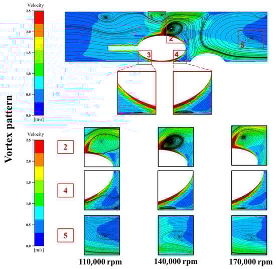 Vortex flow is an important factor that must be examined in the flow field. This is because pressure differences can generate vortices when fluid flows along a profile perpendicular to the velocity []. The presence of a vortex field can significantly affect the development of the flow field, and the velocity clouds are vectorized to add flow traces. Our observations indicate the presence of four distinct vortices, which included a pair of counter-rotating vortices near the vessel wall adjacent to the grinding tool, two relatively larger vortices located at the upstream and downstream edges of the field, and a vortex region downstream of the plaque due to the obstructive effect of the plaque. The counter-rotating vortex pair have formed in the same manner as the Taylor–Couette flow []. The remaining vortices have originated from the four primary vortices. It is noteworthy that the vortex region located downstream at position 5 in the Figure 8 represents shedding, a periodic shedding of vortices caused by fluid on both sides behind the obstructing object. In summary, the examination of vortex flow is crucial for assessing the flow field, particularly when analyzing pressure differences generated by fluid flow along a profile perpendicular to the velocity. The existence of vortex fields has a significant impact on the development of the flow field, as observed through vectorized velocity clouds and flow traces.