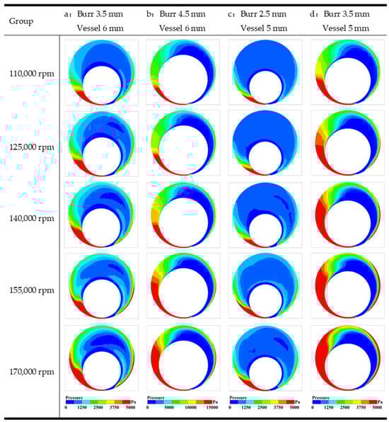 Pressure fields of different groups with different speeds. (a) burr 3.5 mm, vessel 6 mm; (b) burr 4.5 mm, vessel 6 mm; (c) burr 2.5 mm, vessel 5 mm; (d) burr 3.5 mm, vessel 5 mm.