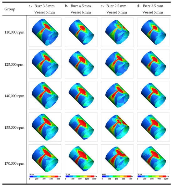 As shown in Figure 11, the stress field distribution is mainly related to the direction of rotation and the morphology of the grinding tool. Wall shear stress is a crucial factor in arterial rupture, with favorable blood dynamics leading to accelerated plaque tissue damage, while unfavorable biomechanical or physiological factors can ultimately result in arterial wall expansion and rupture []. The stress field is mainly concentrated on the side of the closed vessels, and the direction of rotation of the grinding tool affects the development trend of the stress field. As the rotational speed increases, the stress force increases accordingly, and the diffusion area of the stress field increases. The development shape of the stress field is related to the size of the long axis of the grinding tool. With a diameter of 4.5 mm, the grinding tool exhibits a larger volume in comparison to the 2.5 mm and 3.5 mm counterparts. Consequently, the axial diffusion area of the stress field also expands correspondingly.
