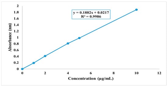 The development of a standard graph for Qu’s absorption at 363 nm in ethanol allowed for quantitative analysis. This method is valuable for accurately determining the drug concentration in solutions. A Qu standard solution was prepared by combining 10 mg of Qu with 10 mL of ethanol, resulting in the creation of a stock solution with a concentration of 10 µg/mL. The highest absorption point for Qu was determined to be at 420 nm following the scanning of dilutions ranging from 0.1 to 10 mg/mL across the 200–600 nm range, as depicted in Figure 3. Subsequently, a calibration curve in ethanol was constructed using solutions from the above-mentioned range, with concentrations set at 1, 2, 4, 5, and 10 µg/mL [].