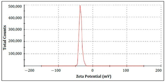 Zeta potential (Zetasizer-1000HS (Malven Instruments, Malvern, UK) is a characteristic of a substance determined by the overall surface charge of nanoparticles. In this study, an electrolyte suspension of NaCl (2 × 10−2 M NaCl), was prepared by diluting it with 50 mL double-distilled water extracted from liquid nanoparticle samples of 5 mL. The pH of the suspension was then adjusted to the desired level. After 30 min, the samples were collected, and following agitation, the equilibrium pH was measured to assess the zeta potential of the metallic particles. The surface potential of the AgNP was computed using the zeta potential. An average of three measurements was recorded for each scenario. The stability of NPs was evaluated based on the zeta potential values, ranging from higher than +30 mV to lower than −30 mV [].