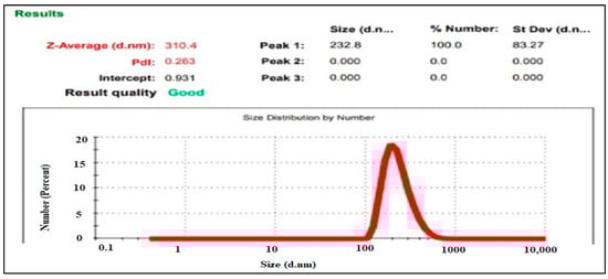 The size of nanoparticles was assessed using the dynamic light scattering method (DLS) with the aid of computerized inspection equipment, specifically the Malvern Zetasizer Nano-ZS, and DTS nano software (version 6.34). Utilizing distilled water to dilute the nanoparticle solution, zetasizer cuvettes were employed to measure the size of the particles. Next, measurements were made at a temperature of 25 °C. At each temperature, the sample was equilibrated for at least 3 min prior to the measurement. The DLS measurements were conducted during alternating increasing and decreasing temperature cycles. The Z-average value obtained from DLS corresponds to the nanoparticles under consideration’s average hydrodynamic diameter. In order to better understand vesicle size and size distribution, data were gathered [].