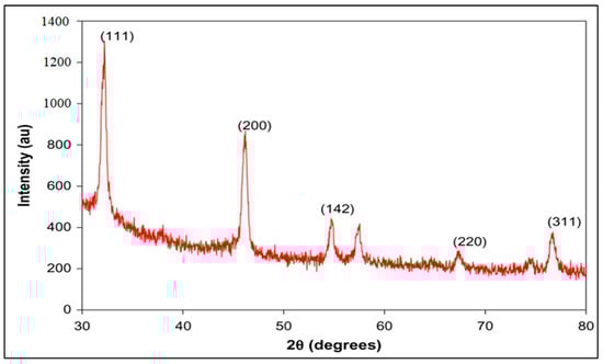 The interference generated by the scattering of X-rays by a crystal’s atoms allows the diffraction pattern to provide information about the crystal’s structure or the nature of a crystalline material. A glass slide was coated with 1 mL of the AgNPs solution, which was then dried in an oven with a temperature of 40 °C. To produce a thin film, the technique had to be carried out three to four times. Cu K radiation, 1 = 1.54056; 2 = 1.54439, was used to produce the spectra in a Phillips Xpert Pro Diffractometer operating at 40 kV and 30 mA. From the angles 35.01° to 79.99°, the diffracted intensities were measured [].