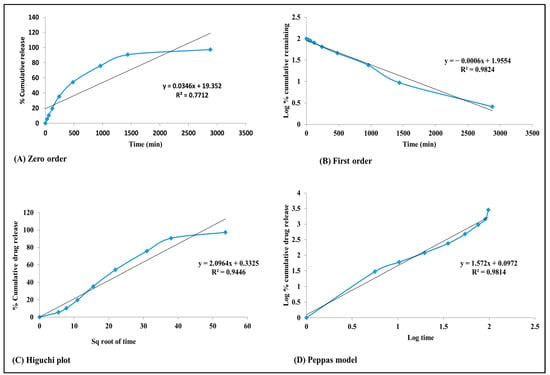 The in vitro drug release kinetics of Qu from the pH 7.4 formulation in PBS were investigated using various kinetic models, and the results are presented graphically represented in zero-order, first-order, Higuchi, and Korsmeyer–Peppas plots.