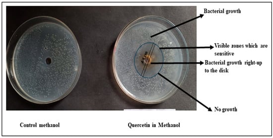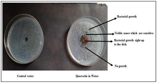 To evaluate the antibacterial activity against Escherichia coli, the agar well diffusion method was employed. This method involves using the disc diffusion technique to measure bacterial inhibition. Test substances are placed within a disc, and the diameter of the zone of inhibition is subsequently measured. In the context of this study, the antibacterial activity of aqueous and solvent extracts was assessed using the agar well diffusion method. Initially, an inoculum containing 106 cfu/mL of the E. coli bacterial culture under examination was evenly spread on agar plates using a sterile swab soaked in the bacterial suspension. Subsequently, 8 mm-diameter wells were created in the agar medium and filled with 100 μL of Qu-AgNPs dissolved in methanol. These plates were allowed to sit for 2 h at room temperature to facilitate diffusion. Following this, the plates were incubated for 24 h at 37 °C in an upright position, and the resulting data were presented as a mean [,,].