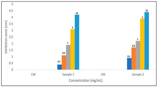 The bar graph summarizes the results of antibacterial assay, displaying the zone of inhibition for each sample in cm, including Sample 1 (Qu-AgNPs in water), Sample 2 (Qu-AgNPs in methanol), CW (control water), and CM (control methanol) at different concentration 0.1, 0.5, 1, 5, and 10 mg/mL.