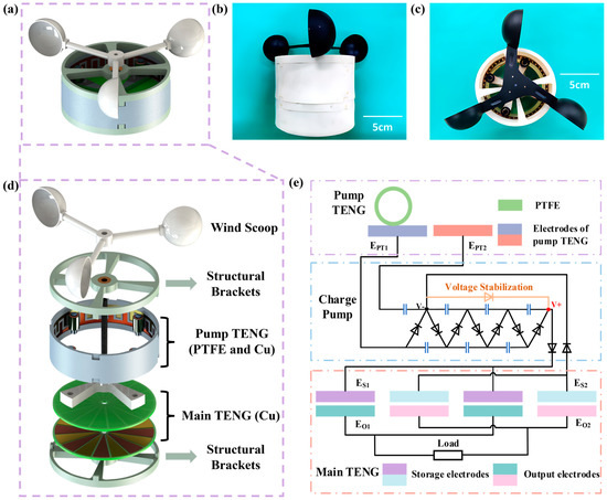 The whole system is divided into two parts, the pump TENG and the main TENG, respectively. The structure of the CR-TENG is schematically shown in Figure 1a, and the physical structure of the CR-TENG is shown in Figure 1b,c. It is mechanically rotated by the environmental wind energy. Moreover, the pump TENG and the main TENG rotate in a coaxial synchronized manner. To reduce frictional resistance and material wear during rotation, the pump TENG adopts a rolling working mode instead of the traditional sliding working mode, and the main TENG adopts a non-contact rotating working mode. To enhance the output performance of the main TENG, the energy generated by the pump TENG is charged directly to the storage electrode of the main TENG after passing through the charge pump circuit. The main TENG generates a lot of inductive charge between the storage electrode and the output electrode during the rotating operation. With the addition of the charge pump, the output performance of the main TENG is far better than the original main TENG and pump TENG.