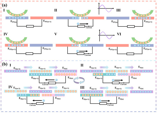 The working principle of the whole system is schematically shown in Figure 1e. During the operation of the pump TENG, PTFE rubs against the copper layer in a rolling fashion because PTFE is attached to the bearing. Replacing sliding friction with rolling friction greatly reduces the frictional resistance during operation and does not change the contact area, which greatly increases the output performance of the pump TENG. A detailed schematic of the operating principle of the pump TENG is shown in Figure 2a. The I state is the initial state, where PTFE contacts EPT(n) to reach an electrostatic equilibrium. As PTFE rolls, PTFE is between the two electrodes as shown in state II. Due to electrostatic equilibrium, positive charges are transferred from EPT(n) to EPT(n+1), resulting in a current. State III is that PTFE is completely in contact with EPT(n+1), and the positive charge realizes complete transfer and reaches the electrostatic equilibrium state. It is assumed that the current generated by the positive charge transfer when PTFE moves from EPT(n) to EPT(n+1) is the forward current. From state IV to state VI, the contact state of PTFE goes from EPT(n+1) to EPT(n+2) and the positive charge transfer goes from EPT(n+1) to EPT(n+2). Therefore, the current generated from state IV to state VI is a negative current. State I to state VI is one cycle, so state VI is equivalent to state I. The energy generated by the pump TENG is recharged through a standard charge pump to the storage electrode of the main TENG.