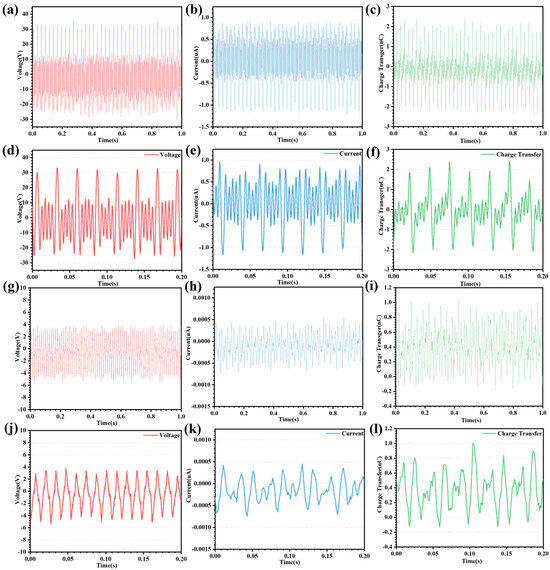 Output performance of the pump TENG and main TENG in the initial state. (a–c) The pump TENG output voltage, current, and charge transfer curves in the initial state. (d–f) Detailed curves of the output voltage, current, and charge transfer sections of the pump TENG in the initial state. (g–i) The main TENG output voltage, current, and charge transfer curves in the initial state. (j–l) Detailed curves of the output voltage, current, and charge transfer sections of the main TENG in the initial state.