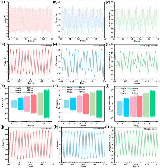 Output performance of the CR-TENG after the supplemental charge strategy. (a–c) Curves of output voltage, current, and charge transfer of the CR-TENG after the rectifier bridge supplemental charge strategy. (d–f) Some detailed curves of the output voltage, current, and charge transfer of the CR-TENG after the rectifier bridge supplemental charge strategy. (g–i) Comparison of output voltage, current, and charge transfer of the CR-TENG at different speeds (240, 300, 360, 420, 480 and 540 rpm) after the charge pump supplemental charge strategy. (j–l) Detailed curves of output voltage, current, and charge portion of the CR-TENG at 540 rpm speed after the charge pump supplemental charge strategy.