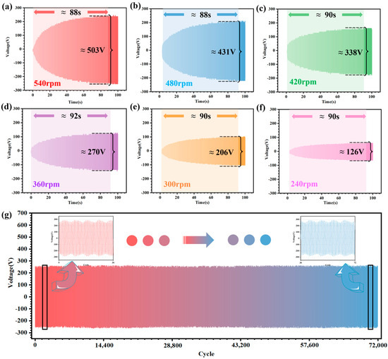 Stability of the CR-TENG after the charge pump supplemental charge strategy. (a–f) Output voltage curves of the CR-TENG from initial state to saturation state at different rotational speeds (240, 300, 360, 420, 480, and 540 rpm). (g) Curve output by the CR-TENG operating at 540 rpm for 72,000 cycles (where the top left graph shows the output voltage curve of the CR-TENG in the initial state, and the top right graph shows the output voltage curve after 72,000 cycles of operation).