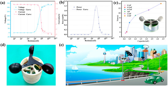 where is the peak-to-peak CR-TENG output voltage and is the load resistor resistance. The output result is shown in Figure 6b; when the load resistance is 100–105 Ω, the CR-TENG output power is extremely low. However, the output power rises sharply when the load resistance is 105–107 Ω. The output power is 1.03 mW when the load resistance is 107 Ω. Based on the curve fitting, it can be concluded that the output power is maximum when the load resistance is 3 × 107 Ω, which is 1.21 mW. By using the CR-TENG to charge capacitors of different capacities, it is used to verify the output performance of the CR-TENG. The result of the charging time of capacitor by the CR-TENG at a speed of 540 rpm is shown in Figure 6c. The results demonstrate that the CR-TENG takes just 1.6 s to charge a 0.1 μF capacitor to 5 V and 14 s for a 3.3 μF capacitor. Figure 6d shows the physical diagram of the CR-TENG. Figure 6e shows the expected application of the CR-TENG in the field of self-powered monitoring and wireless transmission of information in urban environments. The energy harvested by the CR-TENG can power wireless transmission modules and a variety of sensors, such as temperature, humidity, or wind speed sensors. At the same time, the data information collected by the sensors is transmitted wirelessly, ultimately achieving self-powered wireless monitoring of the urban environment.