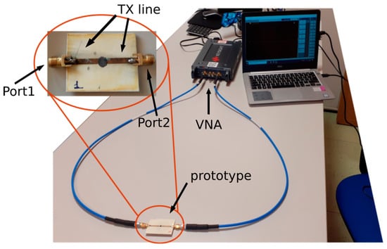 The scattering parameters of the transmission lines and ring resonators are measured with a a two-port USB vector analyser (VNA, P9371A) by Keysight, Santa Rosa, CA, USA (Figure 1).