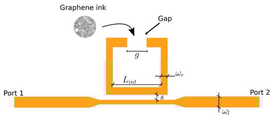 The ring resonator is composed of a high impedance microstrip line fed split ring resonator, as shown in Figure 2. The resonator is fed by a microstrip line that has a characteristic impedance of 50 Ω . This corresponds to a width, w l = 2.9  mm. The ring is coupled to the main line. The coupling distance between the ring and the line is s = 0.2  mm. The internal size of the ring is L i n t = 9  mm. The width of the ring line is w r = 1  mm. The ring is split at one end where the graphene film is deposited. The width of the split area is L g = 2  mm.