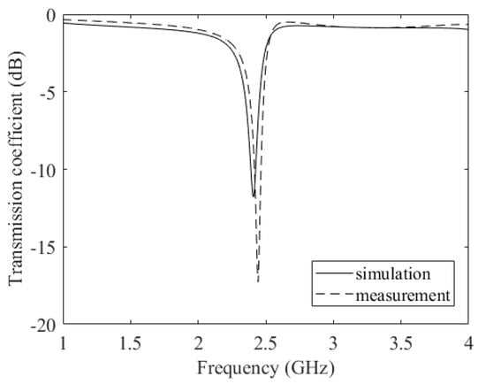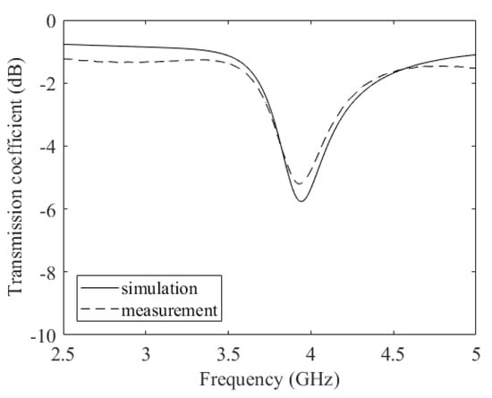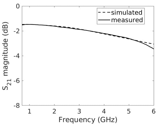 Simulations are performed in the 700 MHz to 6 GHz range and a comparison between measured and simulated parameters is reported in Figure 6 for the transmission coefficient. Even if not reported in Figure 4, two microstrip lines, connected to node A and B, respectively, were used in the simulations.
