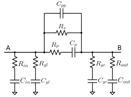 The circuit reported in Figure 4 can be suitably used to describe a graphene-filled gap of 2 mm. The model is chosen to be symmetrical, as is evinced by the measured S-parameters: S 11 = S 22 and S 12 = S 21 .