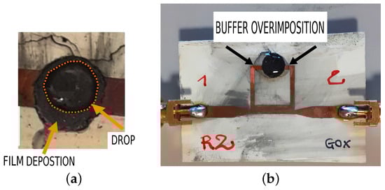 Figure 10. Drop dimensions analysis. (a) All the functionalised graphene is covered by the drop, so the drop interacts only with the film; (b) The drop covers both the graphene ink and the microstrip lines, directly connecting them. FILM to be replaced with ink.
