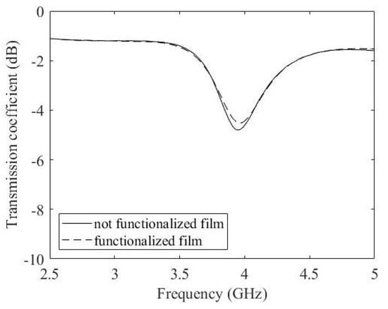 Figure 11. Measured transmission coefficient with not functionalised film (solid line) and functionalised film (dashed line).
